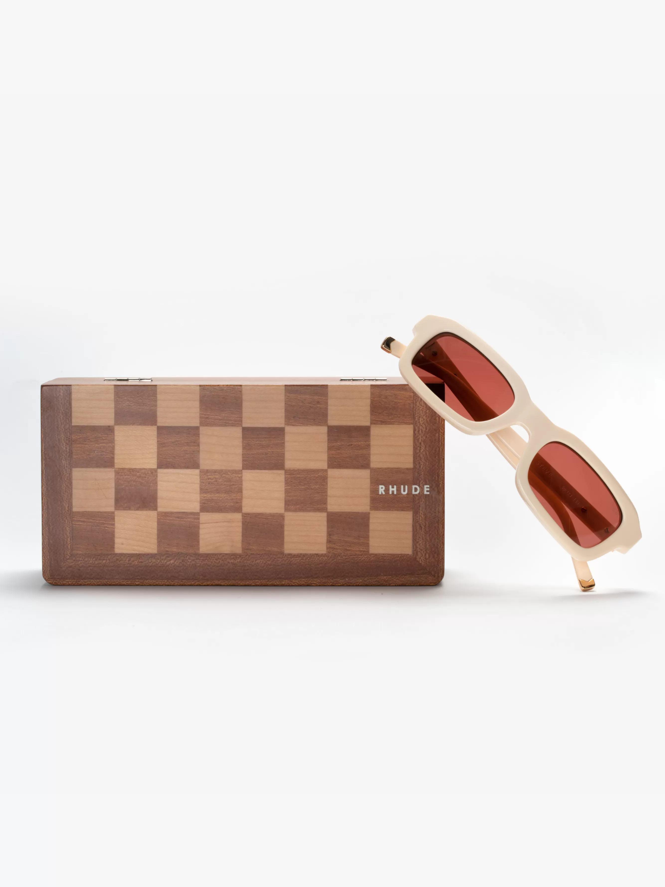 Premium acetate sunglasses handmade in Japan. Offered in a classic cream frame with brown-tinted lenses, featuring UV protection. Features “Rhude” logo positioned on the side of each temple. Hardwood case with chess board pattern and magnetic closure included.100% AcetateIncludes a hard premium wood case and microfiber pouch. One size fits all. Steve Frames Measurements in MM: Front -146mm wideFront – 40mm tallLenses – 50mm wideNose bridge – 23mm wide
